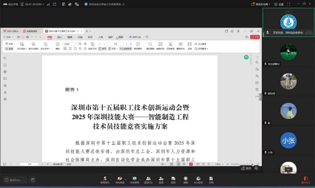 8月29日晚,学会开展深圳市第十五届职工技术创新运动会暨2025年深圳技能大赛——智能制造工程技术员技能竞赛选手赛前培训。学会工作人员大致介绍了本次培训内容。随后主要解读了竞赛的实施方案,包括初赛内容、题型、试题组成、作答形式、竞赛时长、时间地点等。另外特别强调了初赛成绩评定规则及决赛辅导的形式和内容。其次,竞赛专家蔡老师针对竞赛技术方案及题库进行了详细解读,告知选手竞赛所用到的设备和软件,向选手提供了培训的资料。针对选手提出的题型、复习资料、时间安排等问题进行了解答,帮助选手更好地准备初赛。 SZAA - 深圳自动化学会