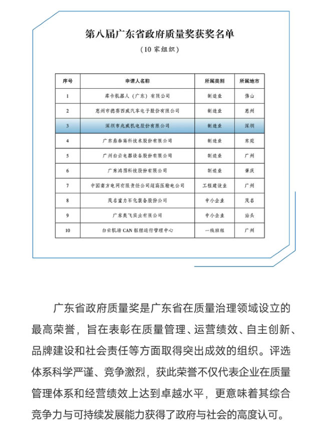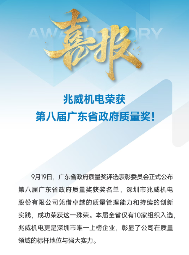 9月19日,深圳自动化学会副会长单位——深圳市兆威机电股份有限公司荣获第八届广东省政府质量奖!