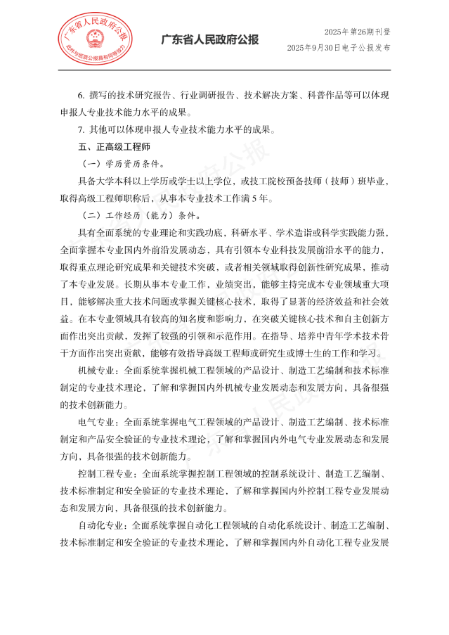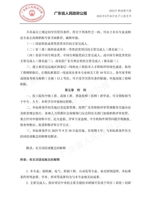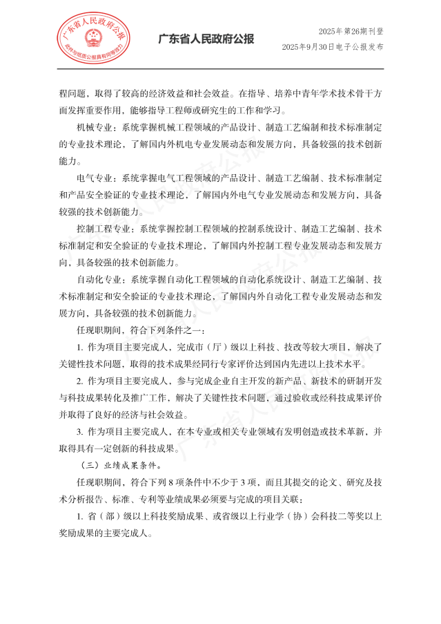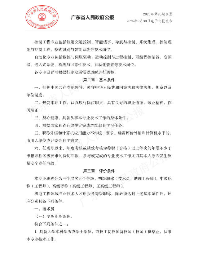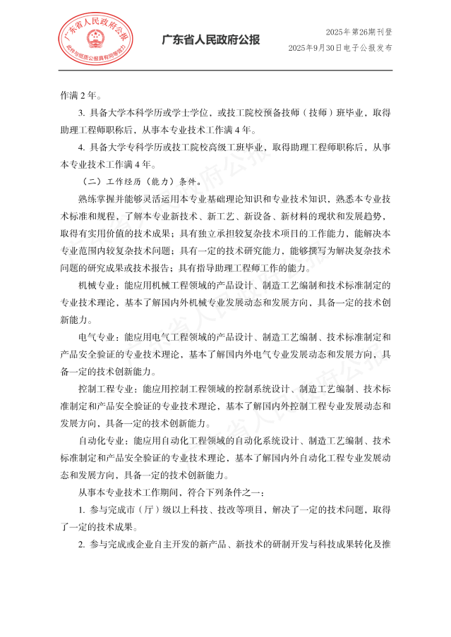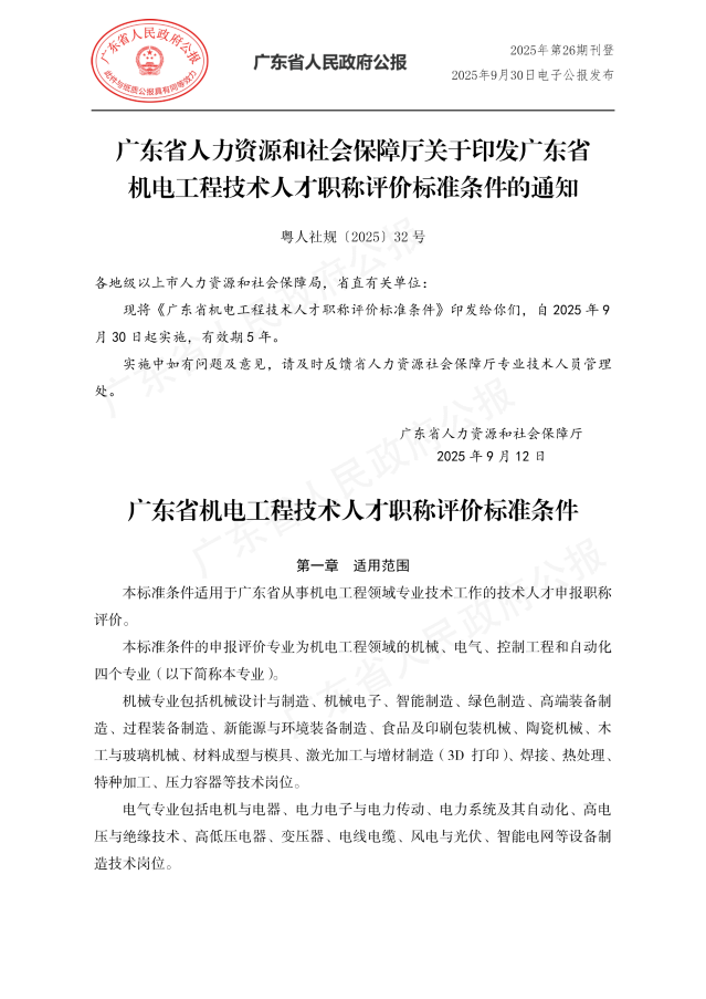 广东省机电工程技术人才职称评价标准条件(粤人社规【2025】32号)