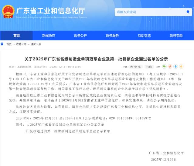 奥拓电子斩获2025年广东省省级制造业单项冠军