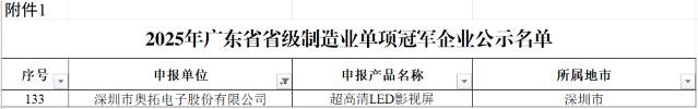 近日,广东省工业和信息化厅公示了《2025年广东省省级制造业单项冠军企业》名单,深圳自动化学会副会长单位——深圳市奥拓电子股份有限公司凭借在超高清LED影视屏领域的深耕细作、技术突破及市场引领地位,成功获评广东省省级制造业单项冠军企业,成为该细分赛道的标杆企业。 广东省制造业单项冠军企业遴选标准严苛,要求企业深耕细分领域5年以上、产品市场占有率位居全国前三或全球前五,且技术水平处于行业领先地位。奥拓电子顺利跻身榜单,彰显了公司在虚拟影视拍摄、LED电影屏两大核心应用领域的行业竞争力。 此次获评省级制造业单项冠军,为奥拓电子注入新的发展动力。未来,公司将继续聚焦超高清LED影视屏核心领域,深化虚拟拍摄、LED电影屏技术创新,助力广东制造业向全球产业链价值链中高端迈进。