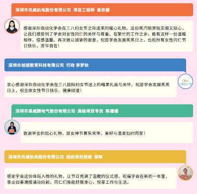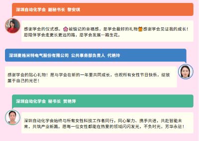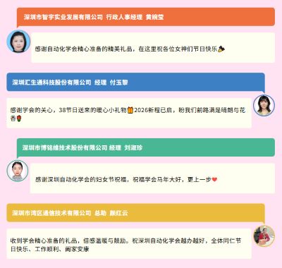 一份份贴心的节日礼品,不仅是学会对女性副秘书长的节日问候,更是对各位长期以来为学会发展辛勤付出、勇担使命的由衷感谢。收到礼品后,各位女性副秘书长纷纷在学会官方活动群分享精美照片,附上饱含真情的祝福语,字里行间满是感动与喜悦,也传递出对学会的美好期许。一句句感谢,一声声祝福,汇聚成学会与女性副秘书长之间温暖的联结,也让本次三八节活动成为学会凝聚巾帼力量的美好契机。长期以来,深圳自动化学会的女性副秘书长们在各自的岗位上发光发热,以专业的能力、坚韧的品格为学会的发展添砖加瓦,展现出新时代巾帼女性的别样风采。